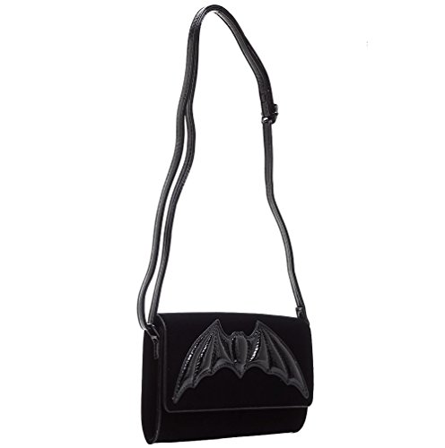 IRON FIST Night Stalker Clutch Bag Small black clutch bag with velvet finish Featuring a faux patent leather bat logo and an adjustable shoulder strap Measures approx 8" X 5.5"